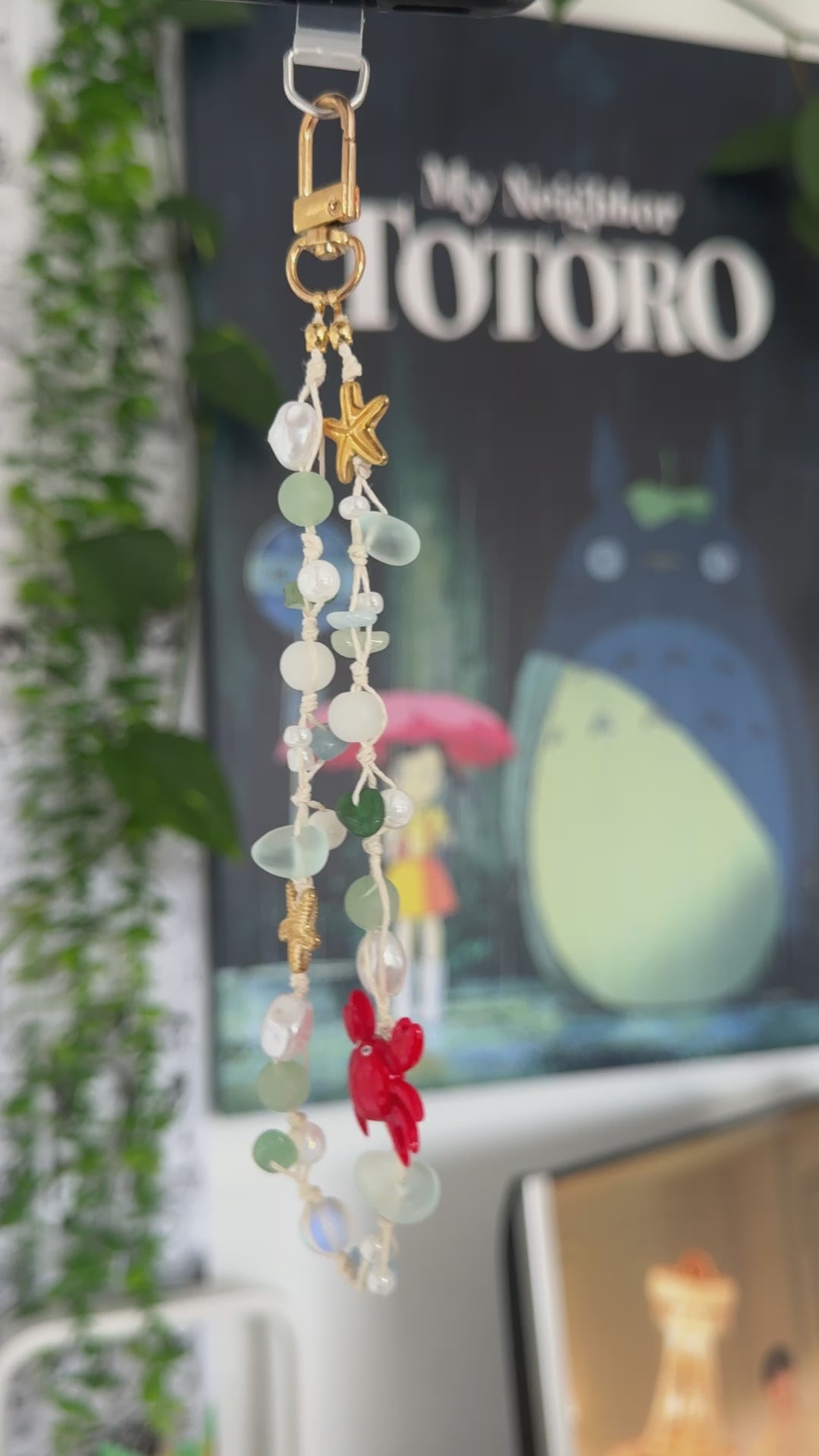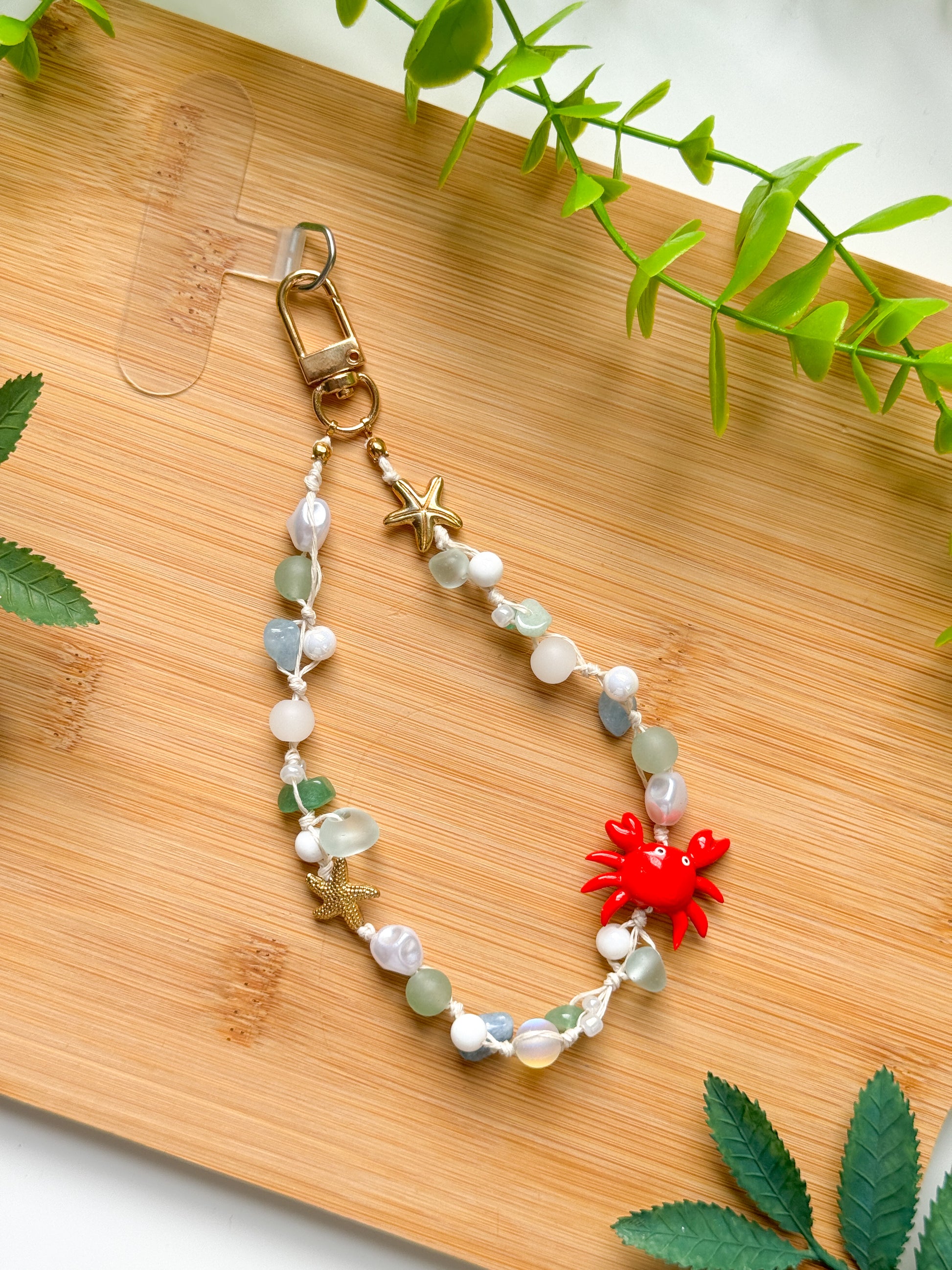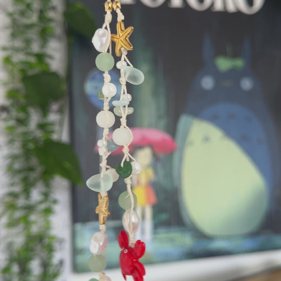 This purple fairy garden themed wristlet is made with high quality glass and acrylic beads and a handmade polymer clay crab charm. This can be used as a phone wristlet strap, keychain or bag charm.