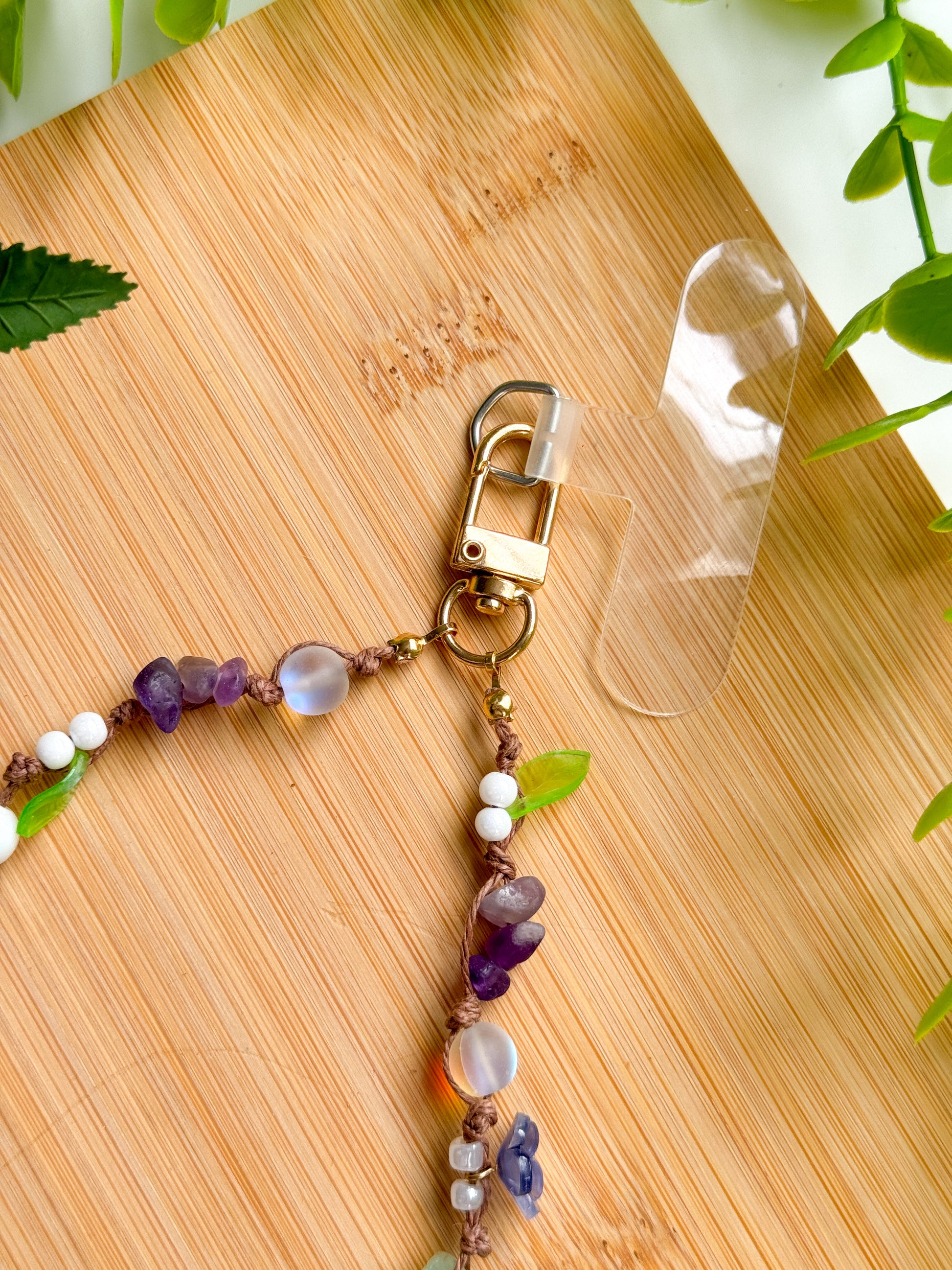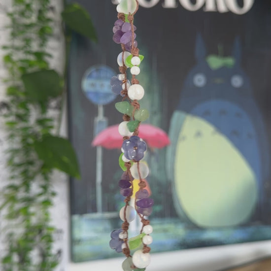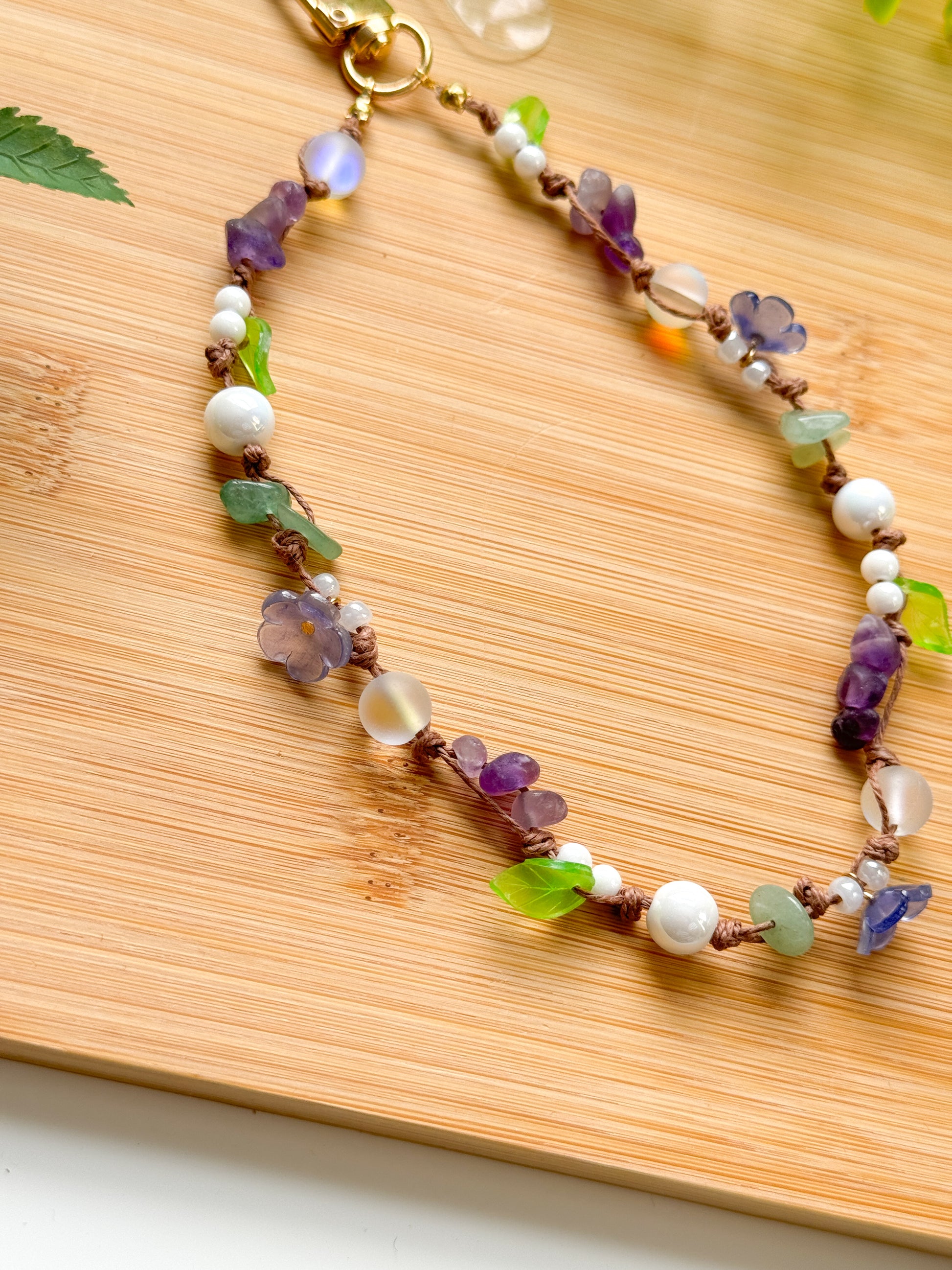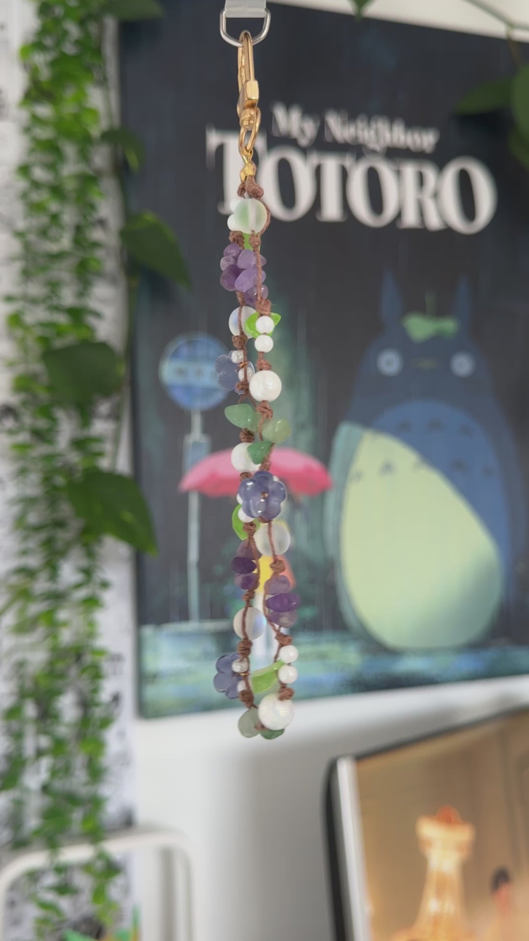 This purple fairy garden themed wristlet is made with high quality glass beads and handmade shrink plastic flowers and leaves. This can be used as a phone wristlet strap, keychain or bag charm.